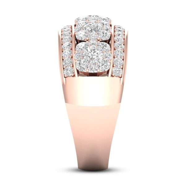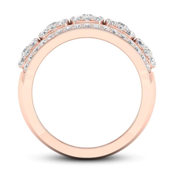 Clusters of dazzling round diamonds adorn the center band of this elegant women’s ring. Even more brilliant round diamonds border above and below the center to complete the look. Fashioned in 14K rose gold, the total diamond weight of the ring is 1 1/5 carats.