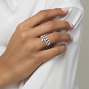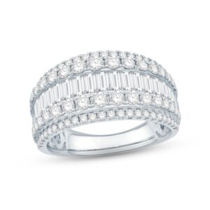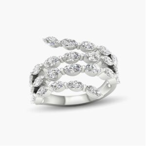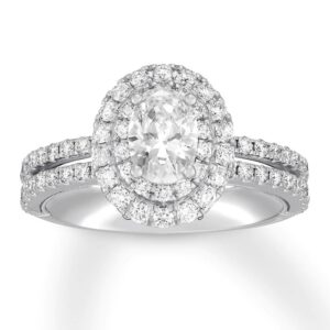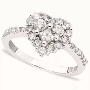This fabulous bridal set for her features a round diamond enveloped in swirls of additional round diamonds at the center of the engagement ring. More round diamonds edge the 10K white gold band of the engagement ring and the matching wedding band. The bridal set has a total diamond weight of 3/4 carat.