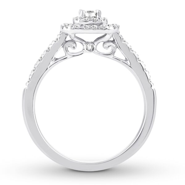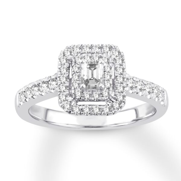 This wonderful engagement ring effortlessly combines vintage and contemporary styles. The sparkling emerald-cut center brings an instant Art Deco look, while shimmering halos of round diamonds add modern flair. The 14K white gold ring has a total diamond weight of 1/2 carat.