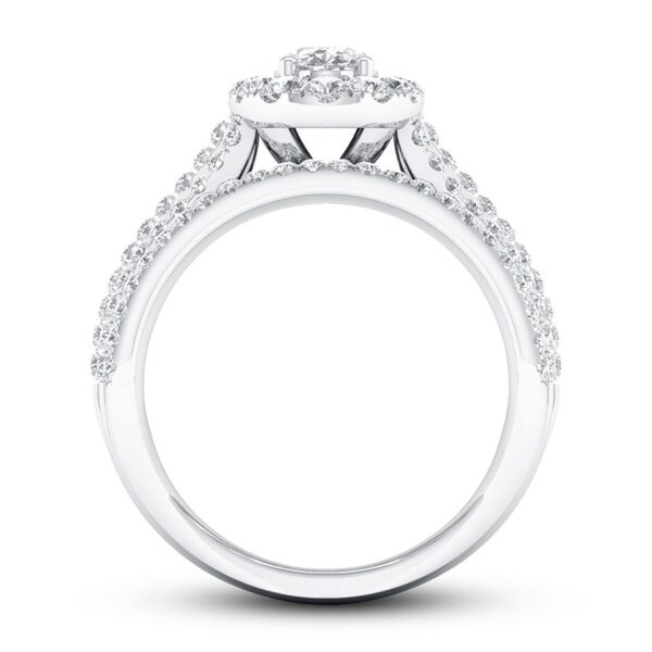 This thrilling engagement ring captures your love with independently certified diamonds. A 1/2-carat oval diamond shines at the center, while brilliant round diamonds create a halo and enhance the generous 14K white gold band. The ring has a total diamond weight of 1-3/8 carats, and the center stone is laser-inscribed with a unique serial number.