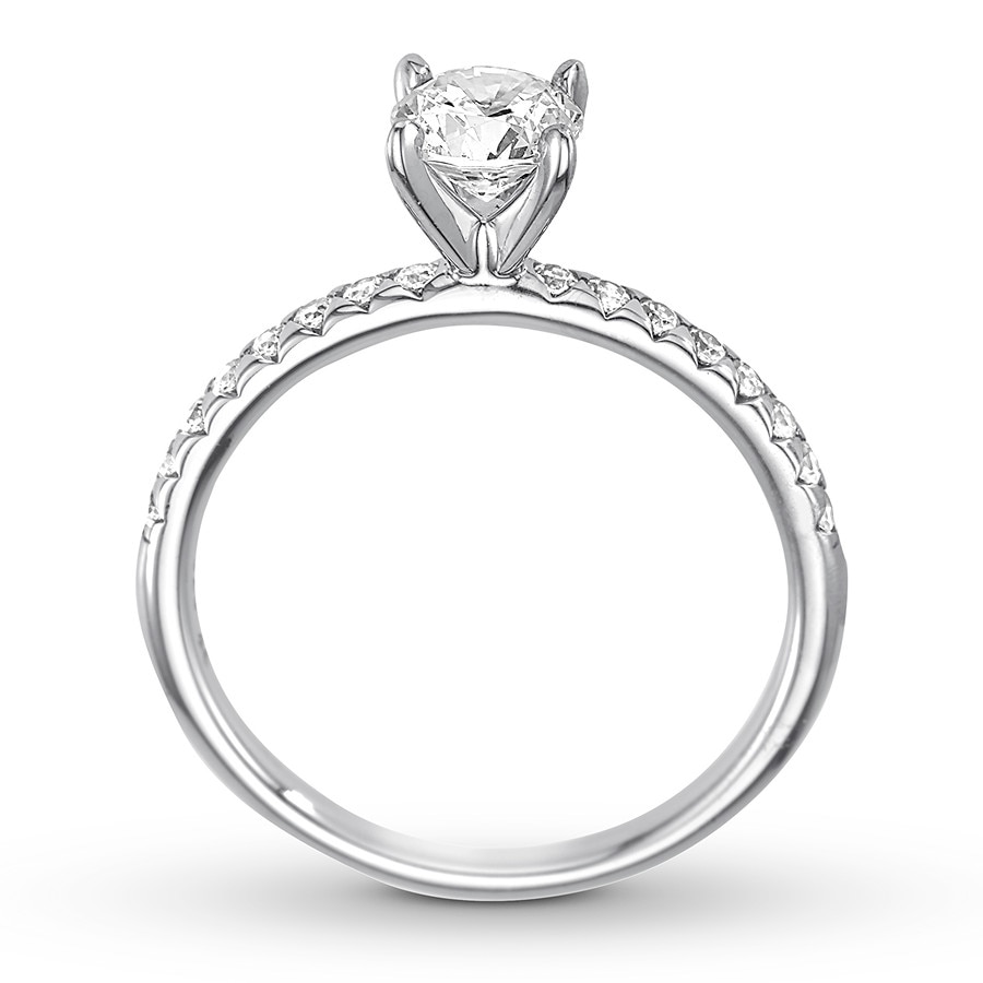 This timeless engagement ring is graced with a sparkling 5/8-carat round diamond center. More diamonds glisten along the band to complement, bringing the total diamond weight to 3/4 carat. The ring is fashioned in 14K white gold.