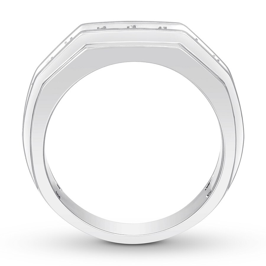 A distinguished way to commemorate your love, this handsome men's wedding band shines with round diamonds totaling 1 carat in weight. The dimensional band is crafted of 10K white gold and features brushed and polished finishes.