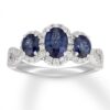 Inspired by vintage designs, this stunning engagement ring offers a captivating take on the traditional three-stone design. Three oval natural sapphires capture attention in the center, while frames of round diamonds add brilliance to complement. More sparkling round diamonds adorn the band to complete the glamorous design. Crafted of 14K white gold, the ring has a total diamond weight of 1/2 carat.